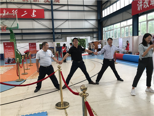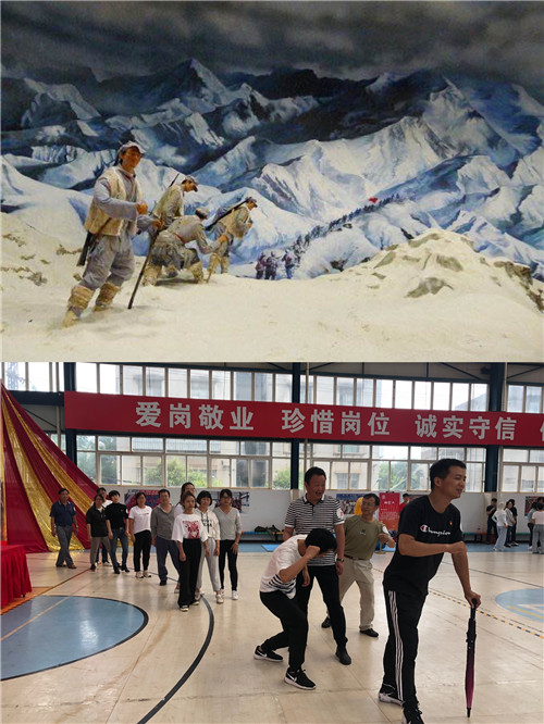 党课后,参会人员来到公司篮球馆参与主题党建活动。活动根据长征路线的重要地点和发生的重要事件,设置了“翻雪山”“过草地”、“飞夺泸定桥”、“遵义会议”“四渡赤水”、“激战腊子口”、“三军会师”等七个游戏,参加活动的人员随机组建成“薪火相传”、“铮铮铁骨”、“众志成城”、“百炼成钢”、“勇往直前”五支队伍参与活动。