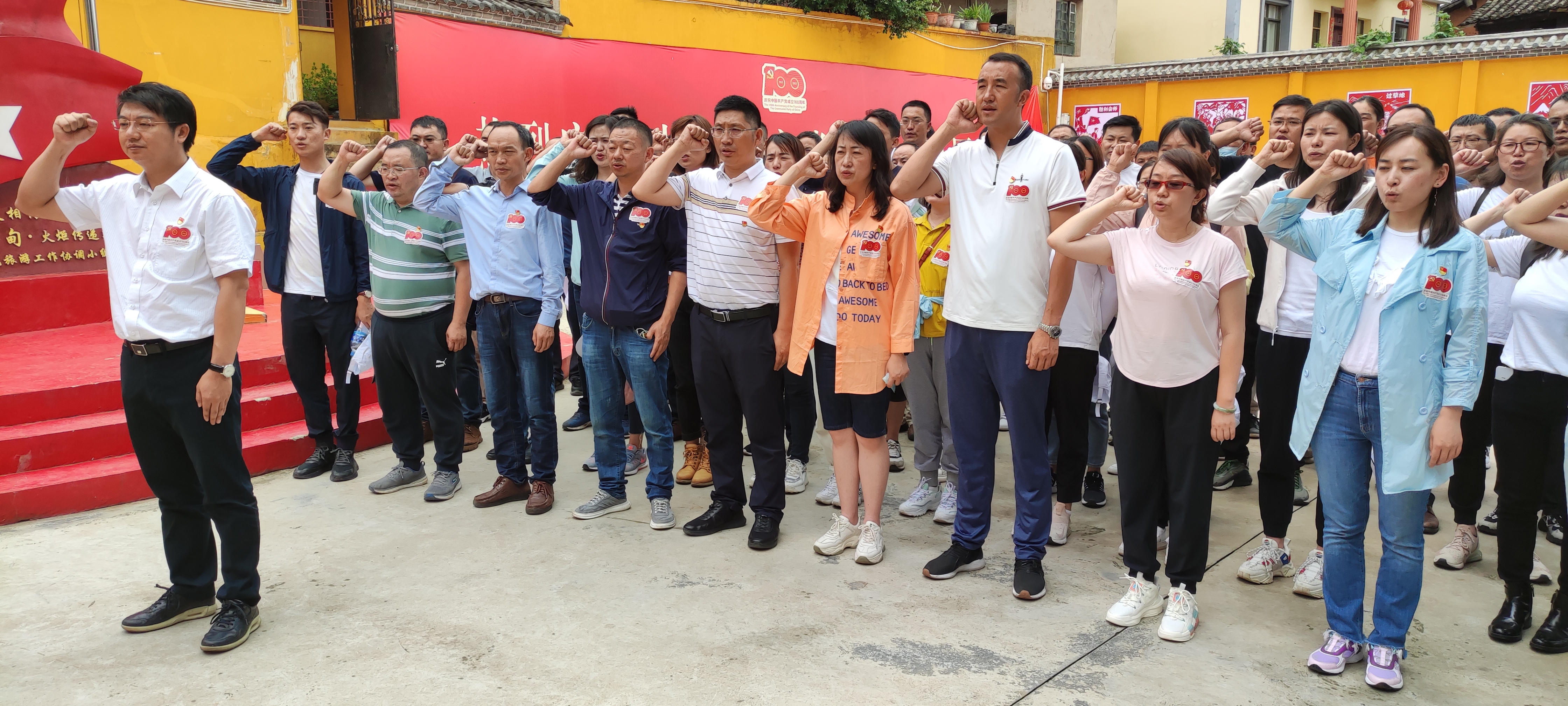 在纪念馆前,面对庄严的党旗,全体党员在万向遵的带领下,高举右手,重温入党誓词。全体党员面向党旗,高声宣誓:“我志愿加入中国共产党,拥护党的纲领,遵守党的章程,履行党员义务,执行党的决定,严守党的纪律,保守党的秘密,对党忠诚,积极工作,为共产主义奋斗终身,随时准备为党和人民牺牲一切,永不叛党。”时间在变,社会在变,不变的是中国共产党人永恒的初心和使命,公司70余名党员干部职工铿锵的誓词,神圣而豪迈。